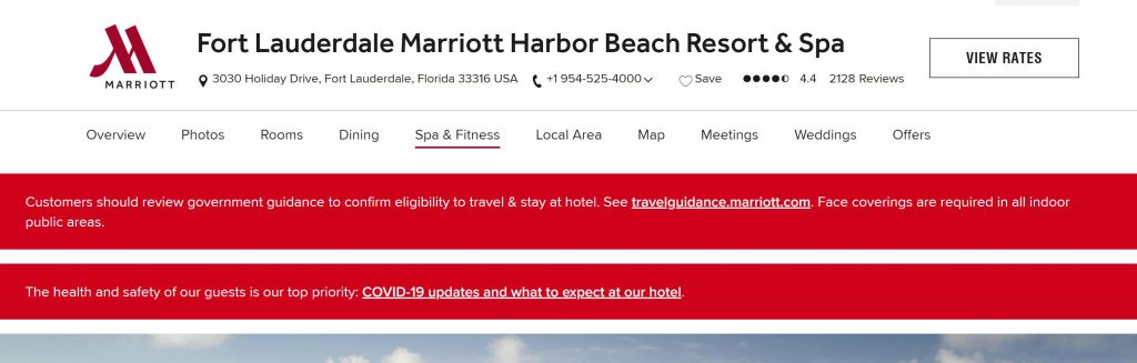 We’re headed to Florida and staying at the Harbor Beach Resort next month. What dining options are open? Can I use their gym? Will they provide a free breakfast based on my Marriott Elite status? These questions and more can be easily accessed now, using their “COVID-19 Updates and What to Expect” tool that was recently made available. Simply go to the hotel’s homepage and it will appear inside a red banner. An example of the Ft. Lauderdale Harbor Beach Resort is below.