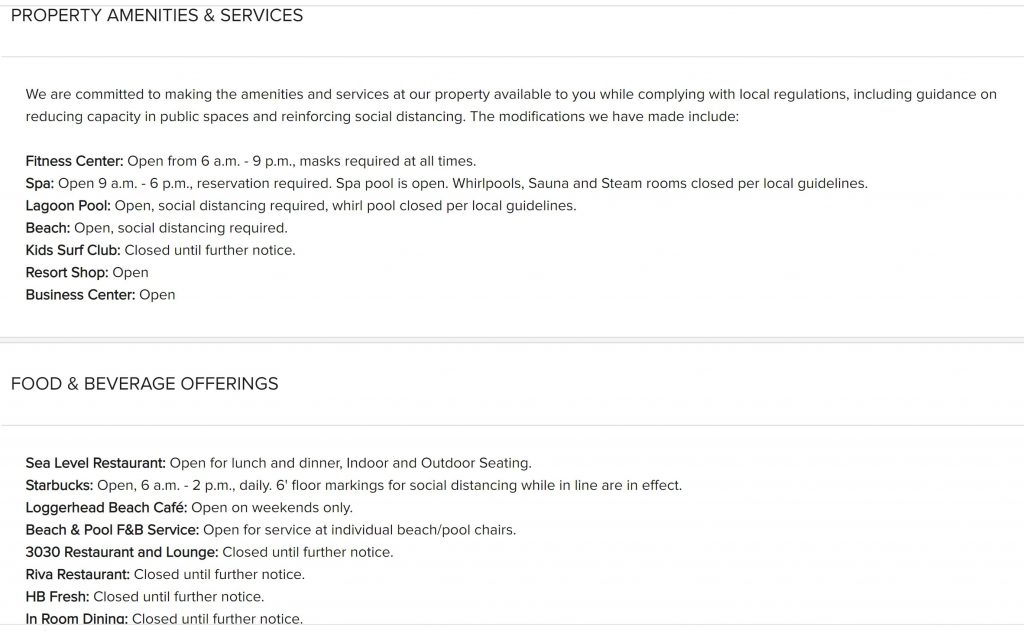 Just follow the link in the second red box and browse through the drop down menus in the various categories, which include COVID related information like cleanliness and social distancing requirements. The categories most pertinent to me personally as a soon-to-be guest was “Properties Amenities and Services“, “Food and Beverage Offerings“, and “Marriott Bonvoy“. By selecting the “Amenities” menu, I found out the fitness center and pool are open (hours are listed for both), and the Kids Surf Club is closed. By selecting the “Dining” option I discovered that 4 of the 8 options to eat were open (hours included). The “Bonvoy” option indicated that the welcome gift was 1000 Bonvoy points — no free breakfast option listed. All this information is very helpful in planning what to expect for when we visit. An partial image of the screen is available below.