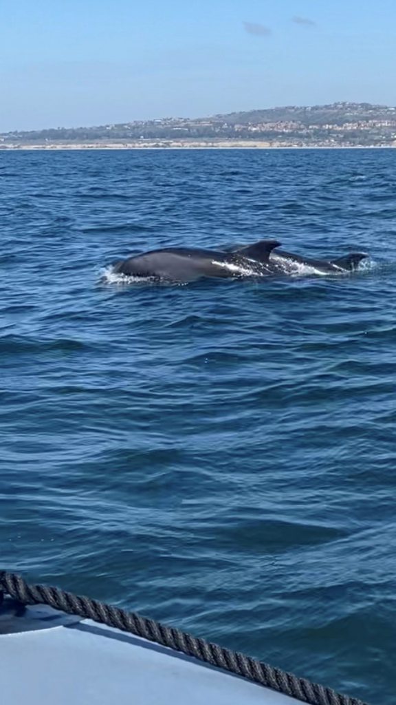 As I mentioned in a previous post, Newport Coast Villas is more restricted in March 2021 compared to July 2020 https://maxingmarriott.com/2021/03/20/all-things-newport-coast-update-march-2021/. That does not apply to businesses opening up and providing tours, excursions, and adventures. We looked into whale watching during our visit there, and decided on Newport Coastal Adventures http://www.newportcoastaladventure.com/. It had great reviews, and I liked the idea of riding in a Zodiak instead of larger boat. It was really fun, and well worth it!! The above picture was taken from our boat — remember we are on a small boat, so those dolphins were very close — and there were LOTS of them. We also saw some grey whales, and sea lions. It was particularly cold and windy that day, but the captain warned us, so we grabbed an extra layer and were fine.
