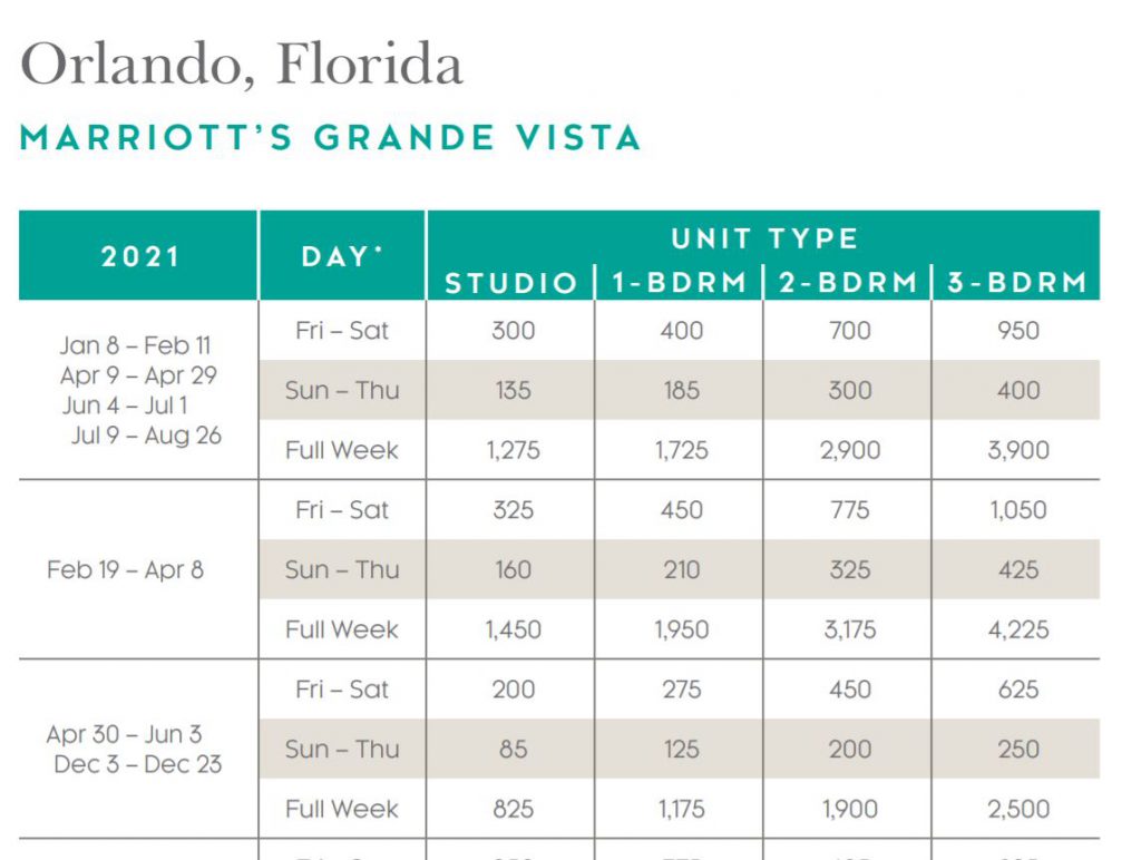 - The IDEAL date to go to Grande Vista, Orlando, FL to MAX your MVC points in 2021 is May 30, 2021 – June 3, 2021, Sunday through Thursday. It would take only 625 MVC points for a 1-bedroom villa for 5-nights (125 * 5)!!! If you went the week later, it would be 925 MVC points for the same bedroom for 5-nights (185 * 5) – SEE THE SAVINGS?