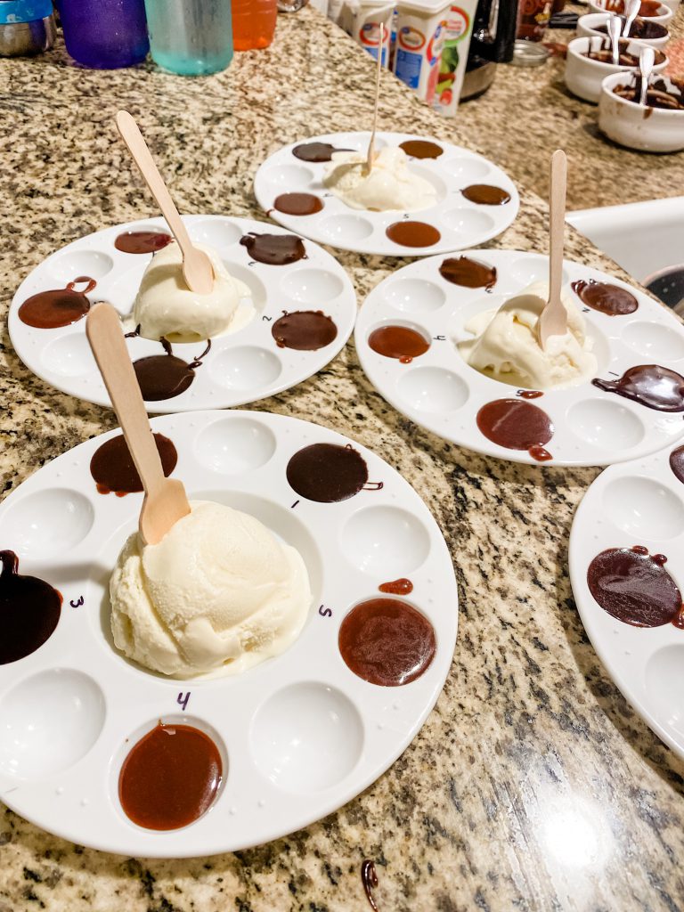 Taste Testing Event Old and young alike love this activity. We have done lots of fun food items in the past — lemonade, Oreos, doughnuts — and this year we did Hot fudge sauces. We bought children’s plastic paint palettes — (U.S. Art Supply 11-Well Round Plastic Artist Painting Palette — Pack of 15 — Paint Color Mixing Trays) and Bulk Mini Wooden Spoons (Bulk Mini Wooden Spoons -Eco Friendly Disposable Biodegradable – 3.75 Inches – 300 Pack Outside the Box Papers Brand) from Amazon. They were perfect to put each hot fudge sauce in the little “paint” hole, with the ice cream in the middle. It was so fun hearing the chatter as they shared what they did and didn’t like about each sauce. I found a new favorite hot fudge sauce myself and may or may not have sneaked another hot fudge sundae after the kids went to bed!!! (HERRELLS Original Hot Fudge Sauce, 10 OZ from Amazon).