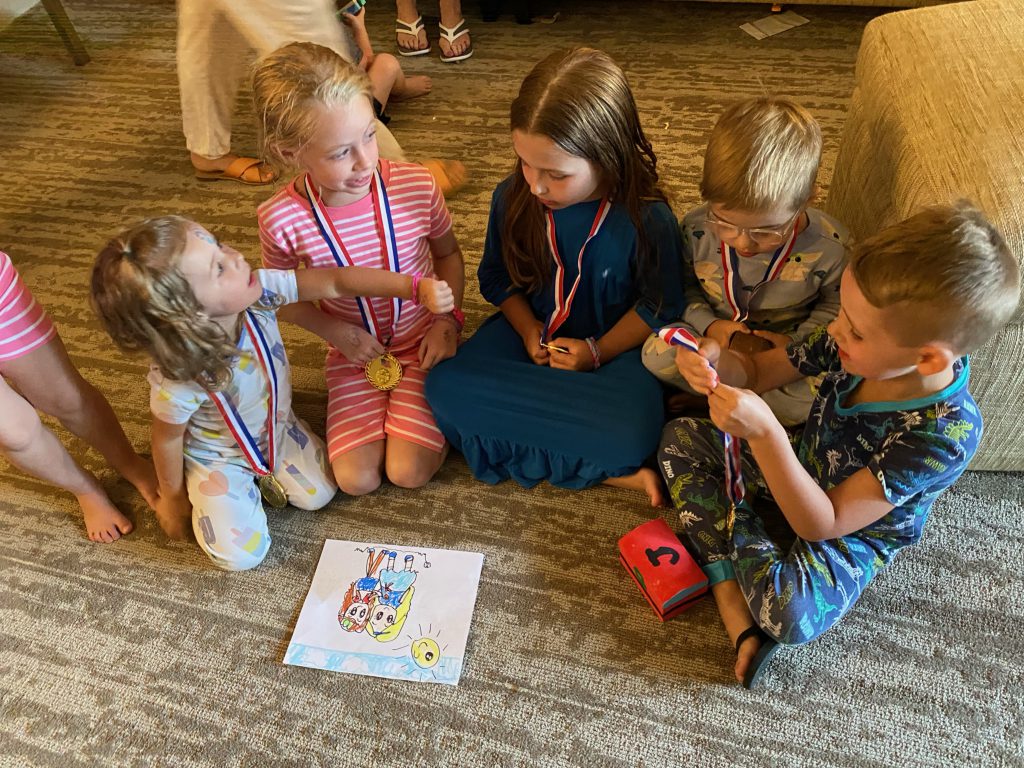 Medal Awards The last night after revealing each child’s “secret cousin”, we recognized each child for an accomplishment and awarded them a medal. We had each child come up while we announced what they were best at (best helper, best friend to everyone, best improved swimmer, etc.) and everyone clapped for them — it was their turn to shine. It really was fun for each of them to cheer each other on, and even the more quiet children were smiling really big during this. It’s a “feel good” activity, for sure!! I just purchased some medals from Amazon that came with the ribbon and everything (Juvale 12-Pack Bulk Metal Olympic Style Gold Winner Award Medals with Ribbons for Sports and Competitions, 2.7 Inches Diameter).