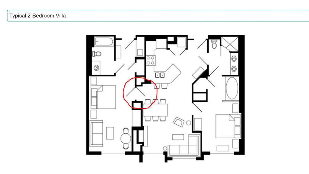 Though I haven’t stayed at all the resorts with these 1 Bedroom options, I have stayed at a few, and the outcome was the same. When I chose the 1 Bedroom (One Entry Door) option, I was put in the corner of the building, and had no concern about any noise from the next room because it wasn’t adjoining. The 1 Bedroom (Master of a 2 Bd) villas are located throughout the resort, and have the potential of having someone staying in the adjoining studio room. I circled the adjoining double door in the floorplan of a 2-bedroom so you could visualize it, if you aren’t familiar with it. The 1-bedroom lock off is to the right of the adjoining door, and the studio is to the left of the adjoining door.