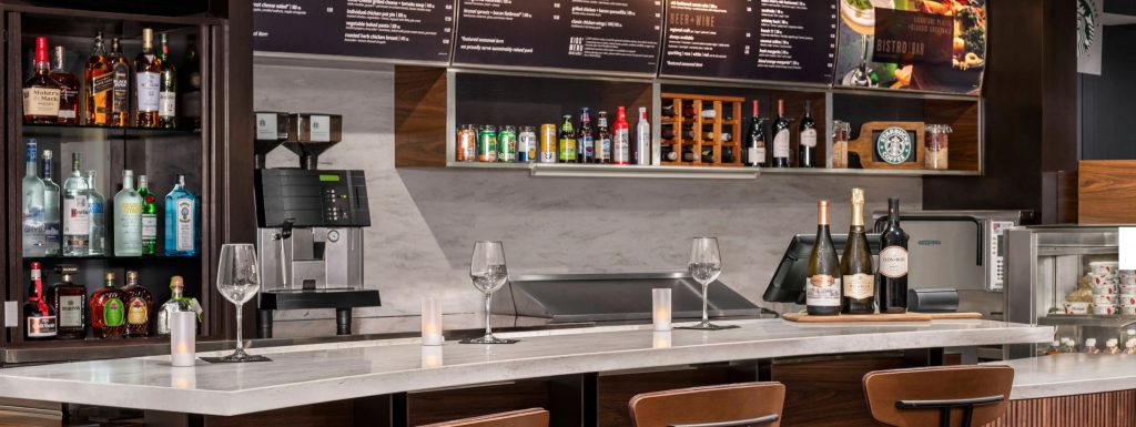 At the center focal point of the lobby is the The Bistro Bar: a casual bar and dining destination featuring a Classic American menu with a contemporary twist. The recently revamped Bistro menu has a selection of classic-inspired breakfast and evening items including a full bar with a wide selection of beer, premium wine and specialty cocktails, from a Black Cherry Old Fashioned to a signature margarita, at participating hotels.