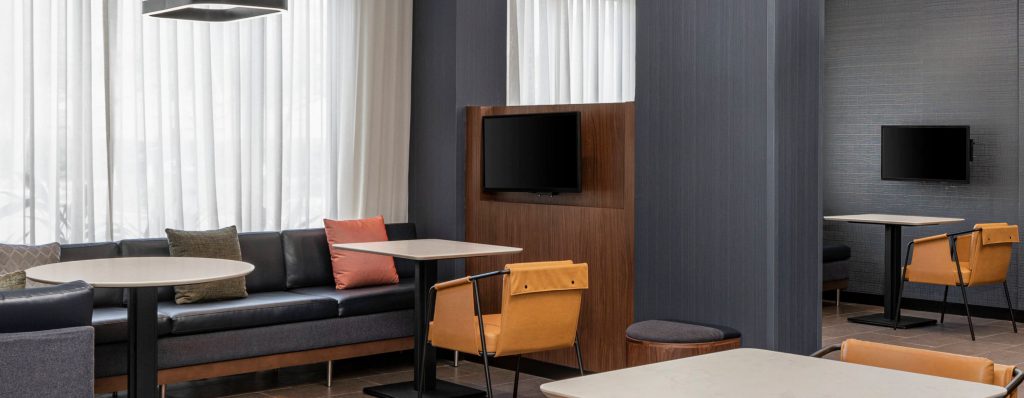Courtyard’s signature media pods, each with their own TV screens and a residential sectional sofa, offer semi-private workspaces that Courtyard guests have come to love, inspiring productivity while working remotely.