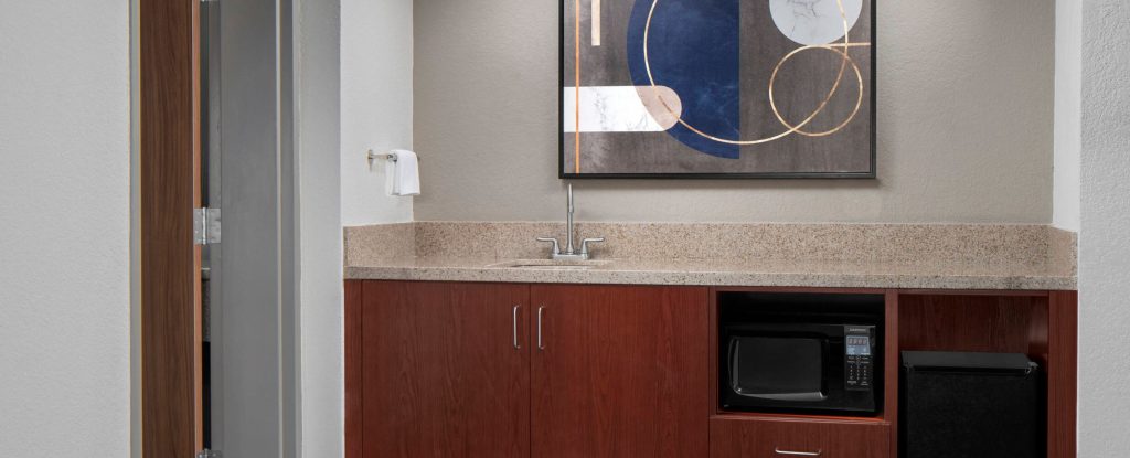 All looks good, and the few guests who have stayed in these updated properties are made positive comments. They especially like the Bistro and options there. The only thing that doesn’t hold the updated modern look is the bathroom. It looks like they painted, but the counters don’t match the vibe of the rest of the rooms. I don’t like the red cabinets with the brown speckled counter — take a look at the pictures below and see if you agree!