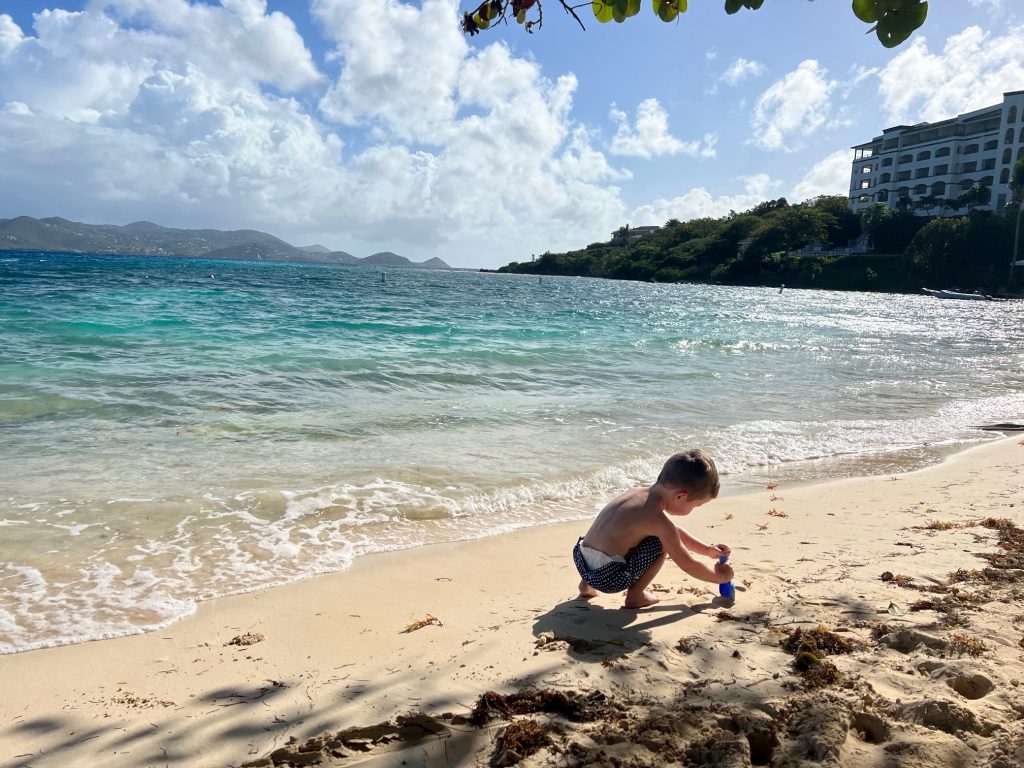I love the beaches in St. Thomas — the turquoise warm water in the Caribbean is something you don’t get in Hawaii. The beach at both the Club and Hotel properties are mellow and located in a bay with gently rolling waves that are fun to jump for small children. As you can see in the picture, a little way offshore, the water turns darker — that is where grass grows under the water. Sometimes a lot of grass washes on shore (didn’t happen while I was there, but I’ve seen pictures from guests that claim it was 2-3 feet high along the shoreline!). And in most places, there was a little bit of the grass in the surf. It isn’t soft long green grass strands, but short yellowish matted plant-like grass — you can see it on the sand in the picture below.