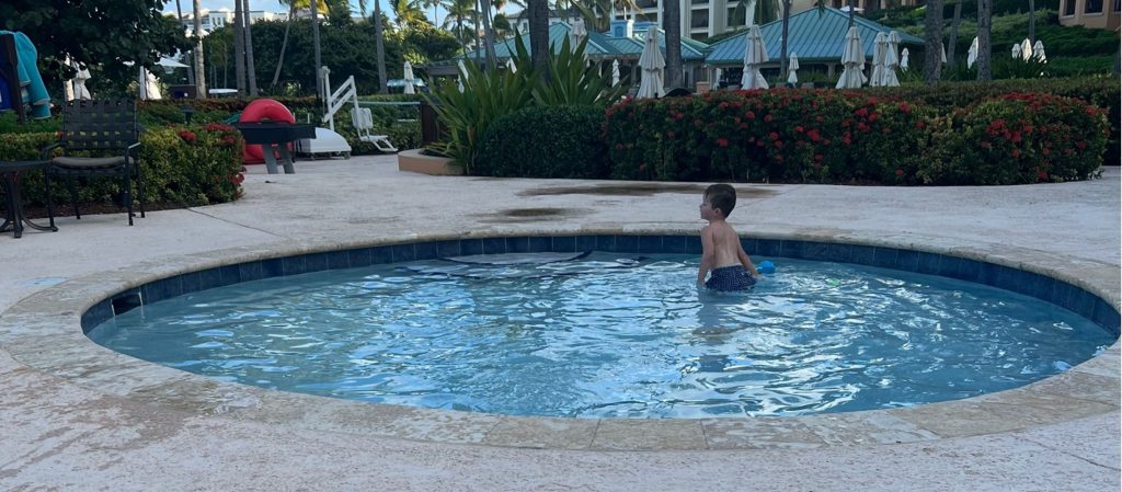The Club property has a main pool, numerous hot tubs, and a kiddie pool — all were heated and warmer than the adjoining hotel pools. The kiddie pool at the Club property was the size of a large hot tub, round in shape, and was only 1 1/2 – 2 ft deep. We never saw anyone in that pool, and it was perfect for our two-year old to play with toys on the sides. Since it was so shallow and warm, our grandson could play in it by himself.