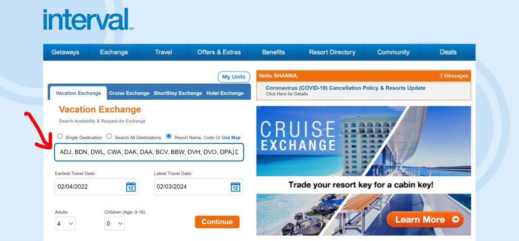 First, go to Interval World website https://www.intervalworld.com/web/cs?a=1500 and login into your account. Select your Active Interval Member account (Select). On the top bar, under the Exchange tab, select “Vacation Exchange” if you are going to use MVC points or “My Units” if you are trading a week. This is the screen you will enter in your resort codes.