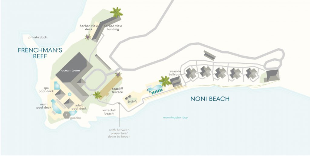 And if THAT isn’t enough to get you excited, there is ANOTHER hotel opening right next to the Frenchman’s Reef Beach Resort — Noni Beach, Autograph Collection — and you know THAT will be nice! The Noni is a smaller property with only 94 rooms, but they are literally ON the beach. And there are FOUR more restaurants at this property!! You could eat at a different restaurant every meal, and never leave the Marriott properties!! Here is a map to give you a better perspective of what these two properties will look like. FYI The MVC Frenchman’s Cove is located just above the “Harbor View Building” on the map, along the beach.