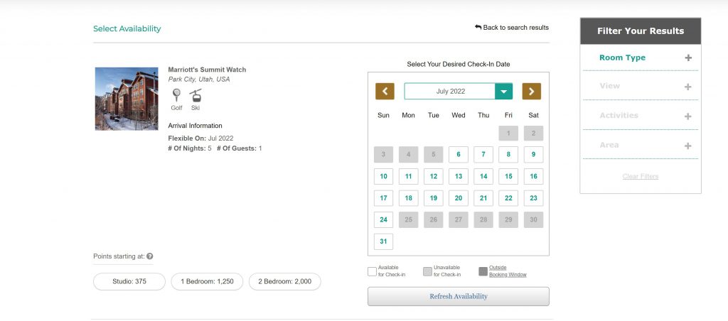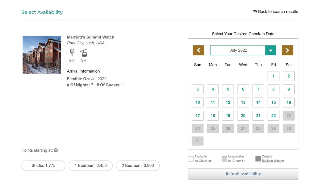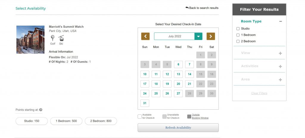 This same principal applies to busy summer months or high seasons. For Summit Watch in Park City, for example, if you searched for a weekend getaway any time in July 2022, you would find NO availability. I copied the screen shot below: