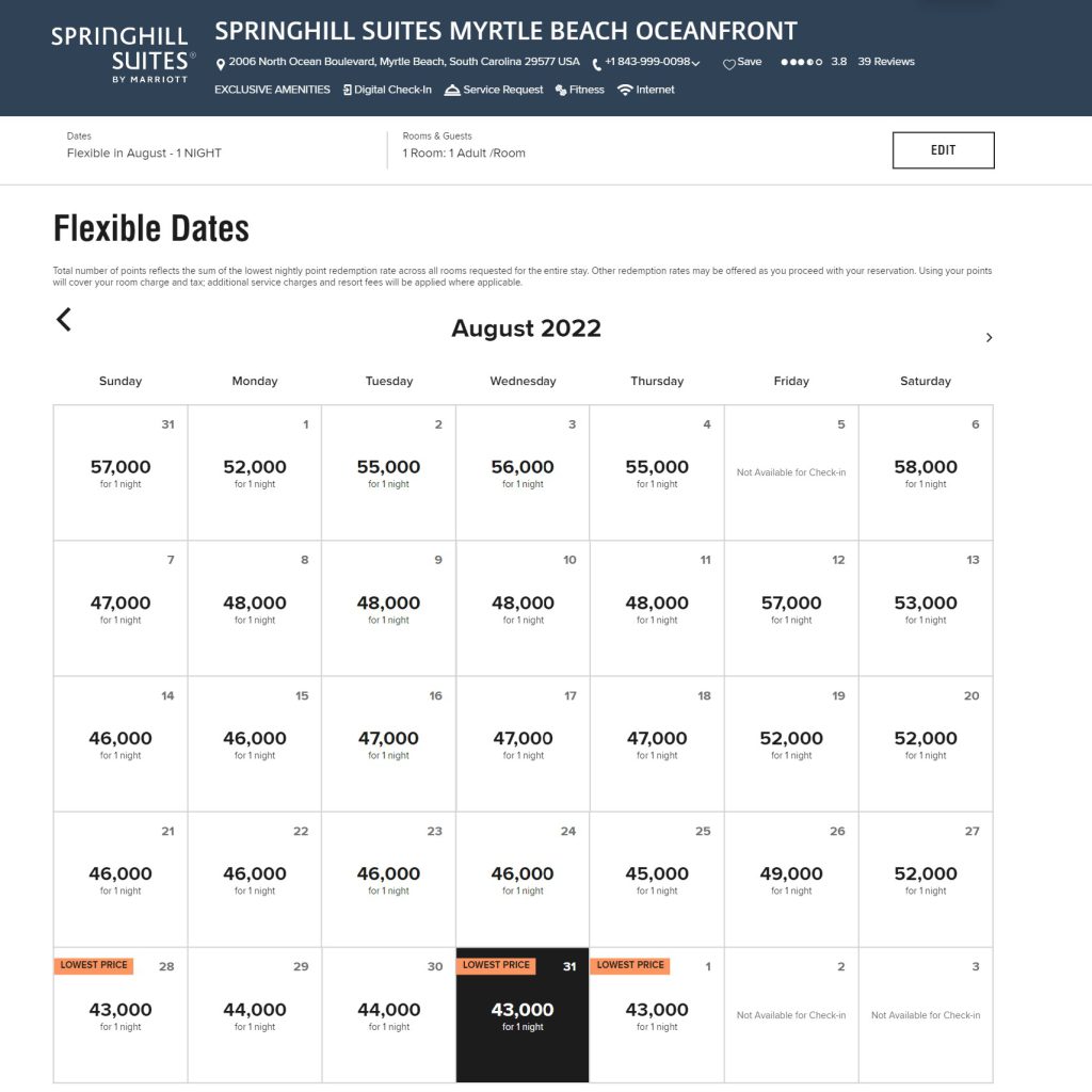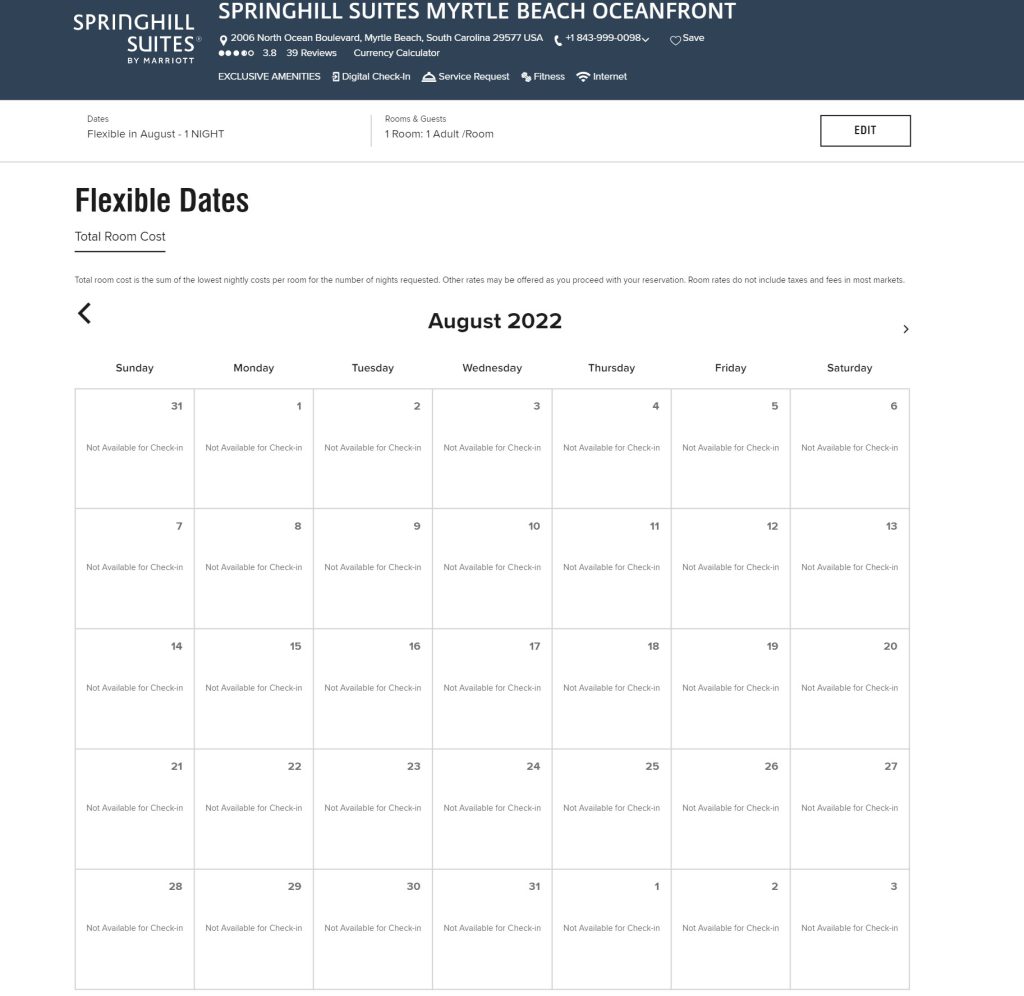 This first screen is showing all the availability at a new Springhill Suites on Myrtle Beach (does the location sound familiar to Marriott Owners? Yes, this is a NEW hotel that just opened steps away from the MVC OceanWatch, and looks SWEET! More about this hotel in a future post in a few weeks so watch for it).