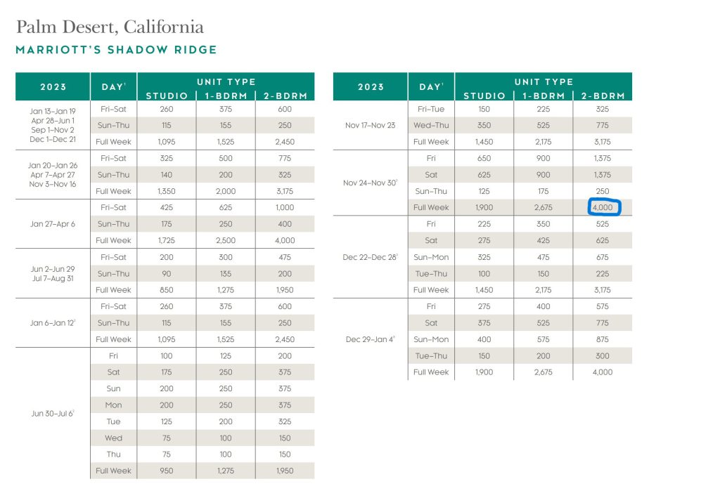 If you want to take this one step further, you can also do a comparison to the number of Bonvoy Points or cash price required on Marriott.com.  Honestly, I don’t usually do this when making my decision of when to travel.  But you can bet that I DO refer to the cash required when celebrating what a great deal I got!!  For this example, it would cost $2900 to stay at Shadow Ridge, Villages during the week of Thanksgiving!  Sometimes you just have to screenshot that cost to your travel partner so they can celebrate with you!!  And that, my fellow owners, is how you reserve a week at your home resort that MAX’s your Ownership!!