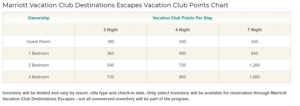 And a tip when reserving Destination Escapes — since more points are typically required to stay during a weekend, if you are reserving a trip for a period of less than a week, scheduling your Destination Escapes on weekends will MAX your ownership value. Destination Escapes doesn’t differentiate between weekends or weekdays.  I’ve included the chart below so you can see the numbers yourself.