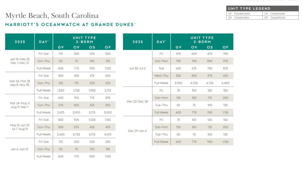 Let me walk you through the process. I’ll use OceanWatch in Myrtle Beach, SC as an example. By looking at the Points Chart for OceanWatch 2023, we can see that the most popular times to go is over the 4th of July (5400 Club Points Ocean Front view for the week). Next most points required is during the summer months – middle of May to middle of August for 4675 Club Points, Ocean Front view.