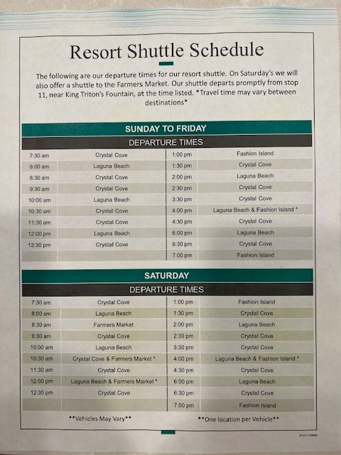 Now things are again back to “normal”, but unfortunately, the shuttle hasn’t returned to the service provided before COVID. You receive a schedule when you check in, which I took a picture of to refer to. You can check out the schedule yourself below. But the CROWDS to get on the shuttle — well, that is frustrating to say the least. We arrived at the resort shuttle stop to go to Crystal Cove 8 minutes before it was scheduled to leave and waited with the 50 other people lugging their beach chairs, beach toys, towels, etc. The trolley showed up, but only about half the people could fit onto the shuttle van. She said she would return and pick us up ASAP — which she did — 25 minutes later! That second shuttle was completely full as well, and many of us were standing in the back holding onto the backs of the chairs for support.